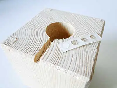 In der Mitte des Blocks bohren Sie ein durchgehendes Loch, welches breit genug für die E27-Fassung ist. Vergessen Sie auch nicht eine kleine Einkerbung, in der nachher das Kabel versteckt werden kann, damit die Lampe gerade steht. Auch das Loch können Sie im Baumarkt vorbohren lassen, wenn Sie kein geeignetes Werkzeug besitzen oder sich das Bohren nicht selbst zutrauen.