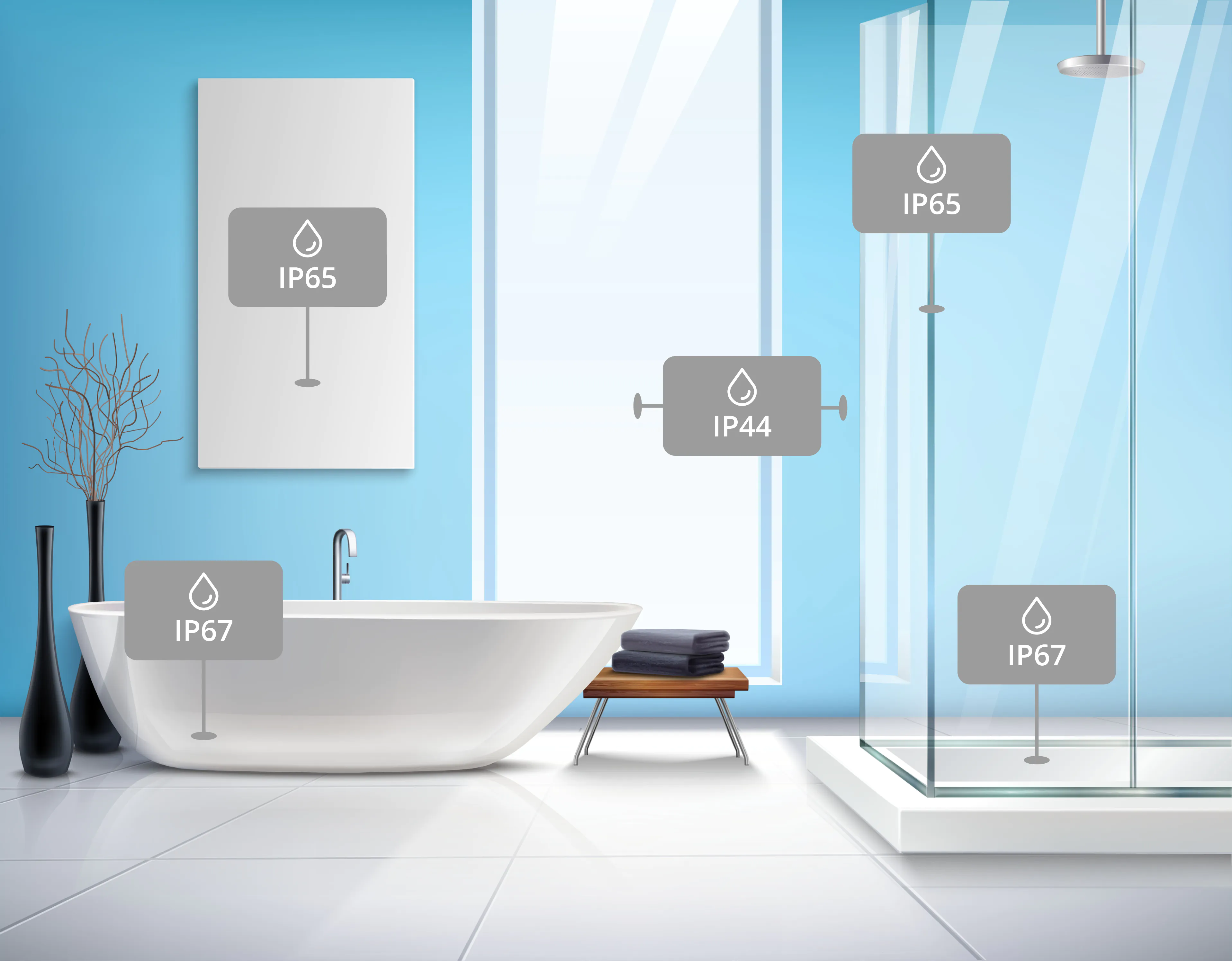 Welche Leuchten Sie brauchen, hängt davon ab, wie Sie Ihr Badezimmer beleuchtungstechnisch gestalten wollen. Dabei müssen Sie auf ein wesentliches Kriterium achten: die IP-Schutzklasse, die zeigt, welches Schutzniveau die Lampe bei Berührung mit Wasser hat. Wir empfehlen Ihnen einen Schutz ab IP44. Mit diesem Schutz sind Leuchten gegen feste Fremdkörper mit ≥ 1 mm Durchmesser und gegen allseitiges Spritzwasser geschützt.