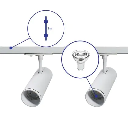 Beschreibung Komplettset 1-Phasen Rail 1 Meter Weiß | incl. 2x Spot + GU10 2700K 3W Dimmbar + Abschlusskappe, Stromanschluss