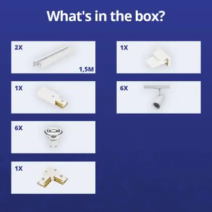 Beschreibung Komplettset 1-Phasen Rail L 1,5 x 1,5 Meter Weiß | incl. 6x Spot + GU10 2700K 3W Dimmbar + Abschlusskappe, Stromanschluss und L -Verbinder
