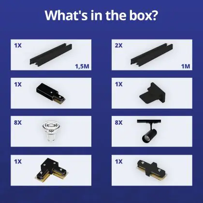 Herstellername | Complete L shaped 1-Phase Track Set Black incl. 8x Spot fixture + GU10 2700K 3W Dim – 1,5 x 2 meter | |