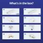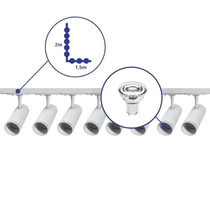 Beschreibung Komplettset 1-Phasen Rail L 1,5 x 2 Meter Weiß | incl. 8x Spot + GU10 2700K 3W Dimmbar + Abschlusskappe, Stromanschluss und L -Verbinder