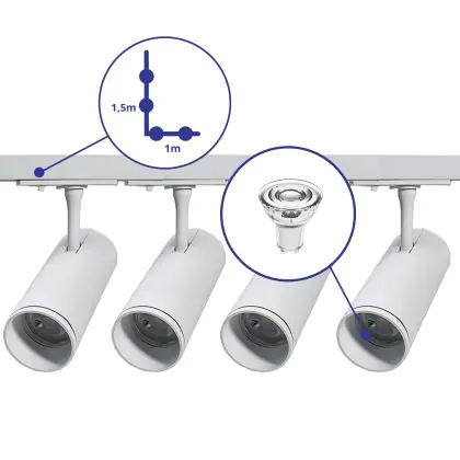 Beschreibung Komplettset 1-Phasen Rail L 1 x 1,5 Meter Weiß | incl. 4x Spot + GU10 2700K 3W Dimmbar + Abschlusskappe, Stromanschluss und L -Verbinder