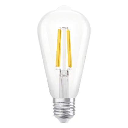 Die Ledvance Fadenlampe LED E27 Birne Klar 3.8W 806lm - 830 Warmweiß | Ersatz für 60W ist eine effiziente E27 LED-Lampe mit Retrodesign und der perfekte Ersatz für Ihre konventionellen 60W Lampen mit E27. Zudem strahlt sie Licht in der Farbtemperatur 3000K - Warmweiß aus und punktet durch eine lange Lebensdauer.