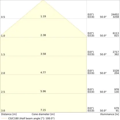 Beispiel: Wird eine Lampe mit einem Abstrahlwinkel von 60 Grad an der Decke (2,5 m Höhe) angebracht, erzeugt sie einen Lichtkegel von 2,9 Metern Durchmesser. Hat die Lampe hingegen einen Abstrahlwinkel von 120 Grad, beträgt der Lichtkegel 8,7 Meter im Durchmesser. |