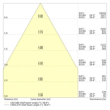 Beispiel: Wird eine Lampe mit einem Abstrahlwinkel von 60 Grad an der Decke (2,5 m Höhe) angebracht, erzeugt sie einen Lichtkegel von 2,9 Metern Durchmesser. Hat die Lampe hingegen einen Abstrahlwinkel von 120 Grad, beträgt der Lichtkegel 8,7 Meter im Durchmesser. |