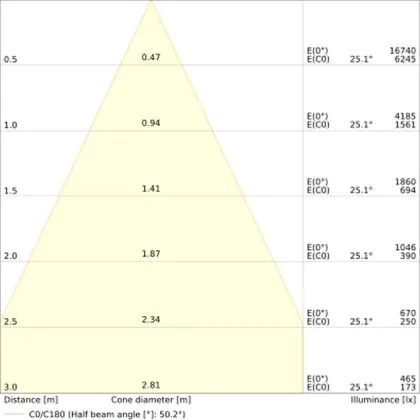 Beispiel: Wird eine Lampe mit einem Abstrahlwinkel von 60 Grad an der Decke (2,5 m Höhe) angebracht, erzeugt sie einen Lichtkegel von 2,9 Metern Durchmesser. Hat die Lampe hingegen einen Abstrahlwinkel von 120 Grad, beträgt der Lichtkegel 8,7 Meter im Durchmesser. |