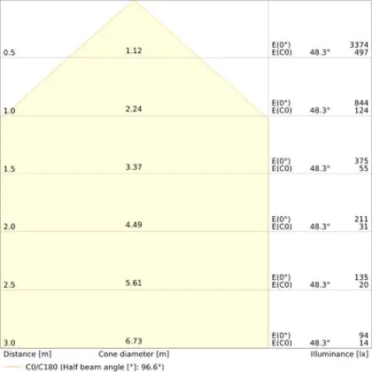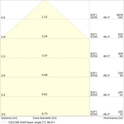 Beispiel: Wird eine Lampe mit einem Abstrahlwinkel von 60 Grad an der Decke (2,5 m Höhe) angebracht, erzeugt sie einen Lichtkegel von 2,9 Metern Durchmesser. Hat die Lampe hingegen einen Abstrahlwinkel von 120 Grad, beträgt der Lichtkegel 8,7 Meter im Durchmesser. |
