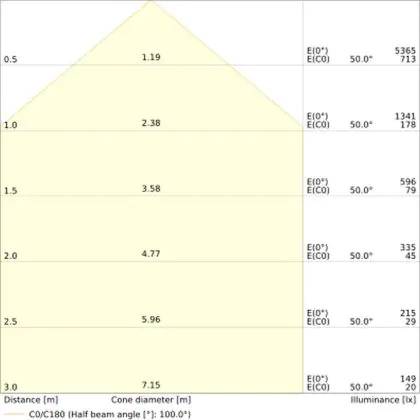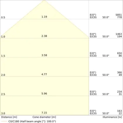 Beispiel: Wird eine Lampe mit einem Abstrahlwinkel von 60 Grad an der Decke (2,5 m Höhe) angebracht, erzeugt sie einen Lichtkegel von 2,9 Metern Durchmesser. Hat die Lampe hingegen einen Abstrahlwinkel von 120 Grad, beträgt der Lichtkegel 8,7 Meter im Durchmesser. |