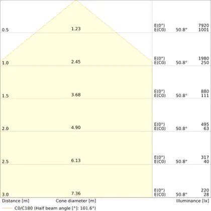Beispiel: Wird eine Lampe mit einem Abstrahlwinkel von 60 Grad an der Decke (2,5 m Höhe) angebracht, erzeugt sie einen Lichtkegel von 2,9 Metern Durchmesser. Hat die Lampe hingegen einen Abstrahlwinkel von 120 Grad, beträgt der Lichtkegel 8,7 Meter im Durchmesser. |