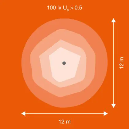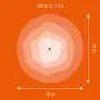 Beispiel: Wird eine Lampe mit einem Abstrahlwinkel von 60 Grad an der Decke (2,5 m Höhe) angebracht, erzeugt sie einen Lichtkegel von 2,9 Metern Durchmesser. Hat die Lampe hingegen einen Abstrahlwinkel von 120 Grad, beträgt der Lichtkegel 8,7 Meter im Durchmesser. |