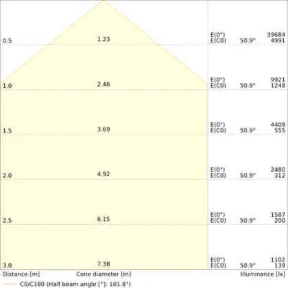 Beispiel: Wird eine Lampe mit einem Abstrahlwinkel von 60 Grad an der Decke (2,5 m Höhe) angebracht, erzeugt sie einen Lichtkegel von 2,9 Metern Durchmesser. Hat die Lampe hingegen einen Abstrahlwinkel von 120 Grad, beträgt der Lichtkegel 8,7 Meter im Durchmesser. |
