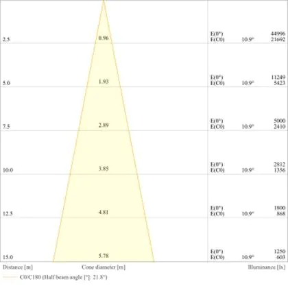 Beispiel: Wird eine Lampe mit einem Abstrahlwinkel von 60 Grad an der Decke (2,5 m Höhe) angebracht, erzeugt sie einen Lichtkegel von 2,9 Metern Durchmesser. Hat die Lampe hingegen einen Abstrahlwinkel von 120 Grad, beträgt der Lichtkegel 8,7 Meter im Durchmesser. |