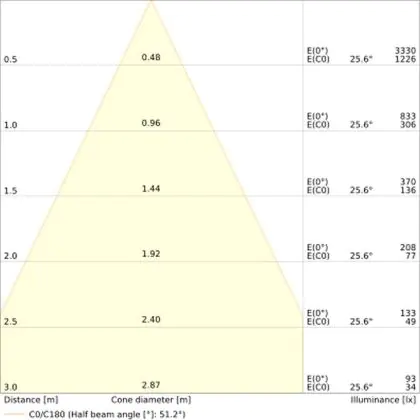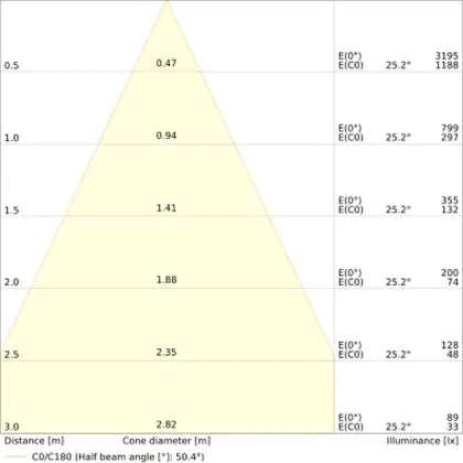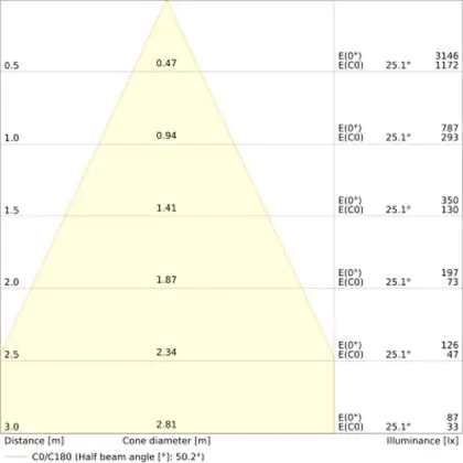 Beispiel: Wird eine Lampe mit einem Abstrahlwinkel von 60 Grad an der Decke (2,5 m Höhe) angebracht, erzeugt sie einen Lichtkegel von 2,9 Metern Durchmesser. Hat die Lampe hingegen einen Abstrahlwinkel von 120 Grad, beträgt der Lichtkegel 8,7 Meter im Durchmesser. |