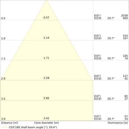 Beispiel: Wird eine Lampe mit einem Abstrahlwinkel von 60 Grad an der Decke (2,5 m Höhe) angebracht, erzeugt sie einen Lichtkegel von 2,9 Metern Durchmesser. Hat die Lampe hingegen einen Abstrahlwinkel von 120 Grad, beträgt der Lichtkegel 8,7 Meter im Durchmesser. |