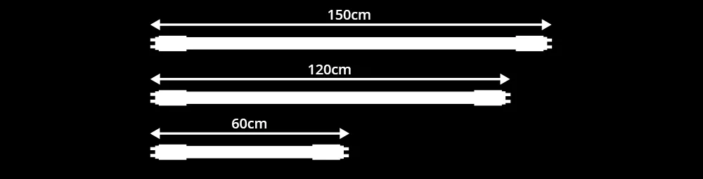 T12 Leuchtstoffröhren → sind in einer Länge von bis zu 150 cm verfügbar. Die Röhren haben einen Durchmesser von 38 mm und verfügen über einen G13-Sockel.