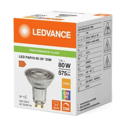Die Mehrfachpackung 10x Ledvance LED PAR16 GU10 Reflektor 7W 575lm 36D - 927 Extra Warmweiß | Höchste Farbwiedergabe - Dimmbar - Ersatz Für 80W ist eine effiziente GU10 LED-Lampe und der perfekte Ersatz für Ihre konventionelle Halogenlampe mit 80W und einem GU10-Sockel, bei welchem die zwei Stifte einen Abstand von 10 mm zueinander haben. Zudem strahlt das Produkt Licht in der Farbtemperatur 2700K - Extra Warmweiß aus und punktet durch eine lange Lebensdauer.