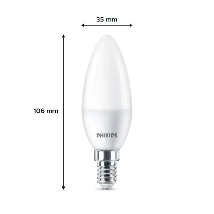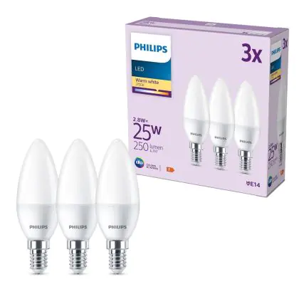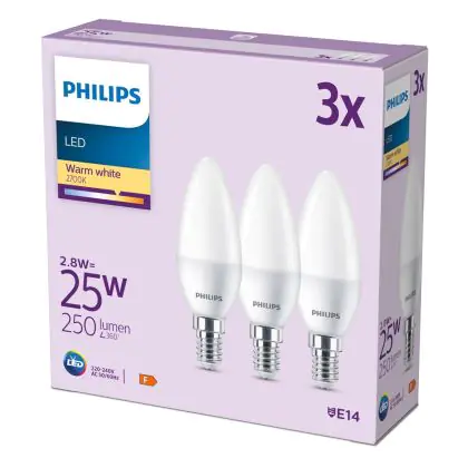Die Mehrfachpackung 3x Philips Glühbirne LED E14 Kerze Matt 3W 250lm - 827 Extra Warmweiß ist eine effiziente E14 LED-Lampe und der perfekte Ersatz für Ihre konventionellen W Lampen mit E14-Sockel. Zudem strahlt sie Licht in der Farbtemperatur 2700K - Extra Warmweiß aus und punktet durch eine lange Lebensdauer.
