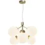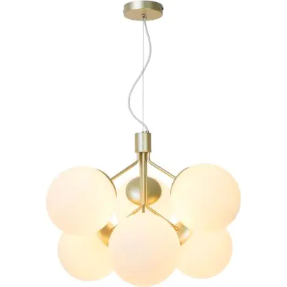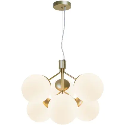 Bei der Pendelleuchte Ivona handelt es sich um eine Neuinterpretation eines klassischen Kronleuchters, wobei das traditionelle Design durch einen etwas organischeren und moderneren Look akzentuiert wird. Mit 6 Glaskugeln strahlt Ivona ein tolles Licht aus, das für einen modernen und extravaganten Stil sorgt. Die Kombination aus Messing und Opalglas schafft einen glamourösen und eleganten Designausdruck. Das Glas dieser Leuchte ist mundgeblasen und handgefertigt. Aufgrund dieses einzigartigen Verfahrens können im Glas Luftblasen entstehen und die Dicke des Glases kann ebenfalls variieren. Dies verleiht dem Glas seinen einzigartigen Charakter und sein lebendiges Erscheinungsbild.