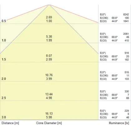 Beispiel: Wird eine Lampe mit einem Abstrahlwinkel von 60 Grad an der Decke (2,5 m Höhe) angebracht, erzeugt sie einen Lichtkegel von 2,9 Metern Durchmesser. Hat die Lampe hingegen einen Abstrahlwinkel von 120 Grad, beträgt der Lichtkegel 8,7 Meter im Durchmesser. |