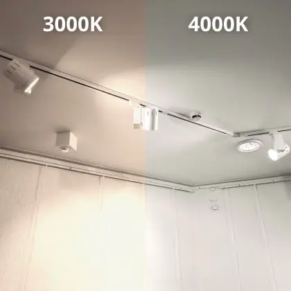 Der LED-Schienenstrahler kommt mit der Farbtemperatur 3000K - Warmweiß daher. Als Faustregel gilt: Je niedriger der Kelvinwert, desto gemütlicher wirkt das Licht.