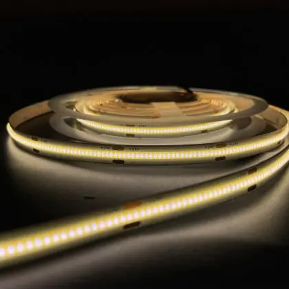 Dank der COB-Technologie ("Chip on Board") ist der LED-Streifen von Noxion mit 480 LEDs/m ausgestattet. Dies ist ein wesentlich höherer Wert als zum Beispiel bei Produkten, die mit SMD-Techonolgie daherkommen. Diese weisen entweder 60 LEDs/m oder 120 LEDs/m auf. Der Vorteil von COB: Das Licht, das der LED-Streifen ausstrahlt, wirkt wesentlich gleichmäßiger und man kann keine einzelnen Lichtquellen ausmachen.