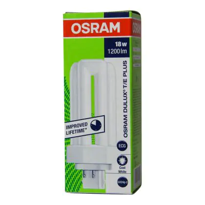 Osram Dulux T/E sind Kompaktleuchtstofflampen, die mit einem elektronischen Vorschaltgerät betrieben werden. Sie haben einen geringen Stromverbrauch und sind daher sehr effizient. Aufgrund ihres GX24q-2 Sockels sind Osram DULUX T/E 18W/840 PLUS GX24q-2 Lumilux Cool White leicht in die Leuchten zu installieren. Die Lampen haben eine sehr lange Lebensdauer von durchschnittlich 13.000 Stunden!
