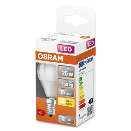 Die Osram LED Star Classic E14 Kugel Matt 3.3W 250lm - 827 Extra Warmweiß | Ersatz Für 25W ist eine effiziente E14 LED-Lampe und der perfekte Ersatz für Ihre konventionellen 25W Lampen mit E14-Sockel. Zudem strahlt sie Licht in der Farbtemperatur 2700K - Extra Warmweiß aus und punktet durch eine lange Lebensdauer.