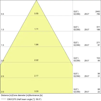Beispiel: Wird eine Lampe mit einem Abstrahlwinkel von 60 Grad an der Decke (2,5 m Höhe) angebracht, erzeugt sie einen Lichtkegel von 2,9 Metern Durchmesser. Hat die Lampe hingegen einen Abstrahlwinkel von 120 Grad, beträgt der Lichtkegel 8,7 Meter im Durchmesser. |