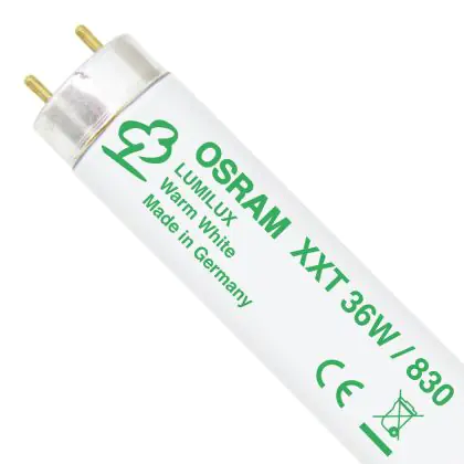 Die Osram Lumilux XXT T8 36W - 830 Warmweiß | 120cm ist eine T8 Leuchtstoffröhre von Osram mit einer Länge von 1200 mm. Das Produkt verfügt über 2 Pins und hat einen Durchmesser von 26 mm. Die Röhre strahlt Licht in der Farbtemperatur 3000K - Warmweiß aus und punktet durch eine lange Lebensdauer.