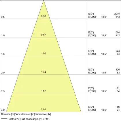 Beispiel: Wird eine Lampe mit einem Abstrahlwinkel von 60 Grad an der Decke (2,5 m Höhe) angebracht, erzeugt sie einen Lichtkegel von 2,9 Metern Durchmesser. Hat die Lampe hingegen einen Abstrahlwinkel von 120 Grad, beträgt der Lichtkegel 8,7 Meter im Durchmesser. |