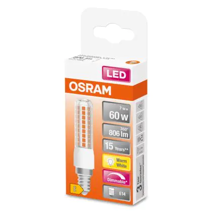 Die Osram Special T Slim LED E14 Klar 6.5W 806lm - 827 Extra Warmweiß | Dimmbar - Ersatz Für 60W ist eine effiziente E14 LED-Lampe und der perfekte Ersatz für Ihre konventionellen 60W Lampen mit E14-Sockel. Zudem strahlt sie Licht in der Farbtemperatur 2700K - Extra Warmweiß aus und punktet durch eine lange Lebensdauer.
