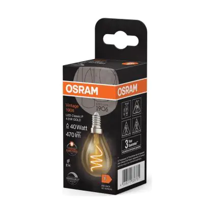 Die Osram Vintage 1906 LED Classic Slim E14 Birne Fadenlampe Gold 4.9W 470lm - 922 Extra Warmweiß | Höchste Farbwiedergabe - Dimmbar - Ersatz Für 40W ist eine effiziente E14 LED-Lampe mit Retrodesign und der perfekte Ersatz für Ihre konventionellen 40W Lampen mit E14. Zudem strahlt sie Licht in der Farbtemperatur 2200K - Extra Warmweiß aus und punktet durch eine lange Lebensdauer.