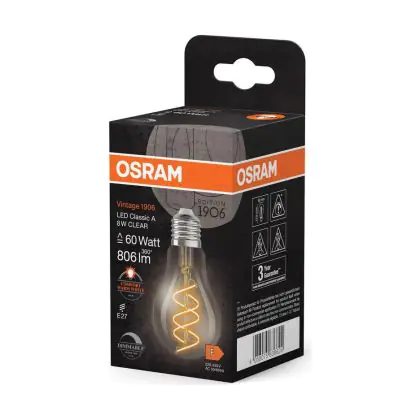 Die Osram Vintage 1906 LED Classic Slim E27 Birne Fadenlampe Klar 8W 806lm - 922 Extra Warmweiß | Höchste Farbwiedergabe - Dimmbar - Ersatz Für 60W ist eine effiziente E27 LED-Lampe mit Retrodesign und der perfekte Ersatz für Ihre konventionellen 60W Lampen mit E27. Zudem strahlt sie Licht in der Farbtemperatur 2200K - Extra Warmweiß aus und punktet durch eine lange Lebensdauer.