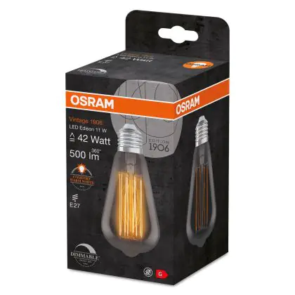 Die Osram Vintage 1906 LED E27 Edison Filament Smokey 11W 500lm - 818 Extra Warm White | Dimmable ist eine effiziente E27 LED-Lampe mit Retrodesign und der perfekte Ersatz für Ihre konventionellen 42W Lampen mit E27. Zudem strahlt sie Licht in der Farbtemperatur 1800K - Extra Warmweiß aus und punktet durch eine lange Lebensdauer.