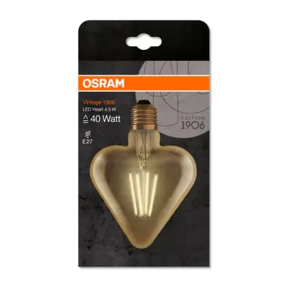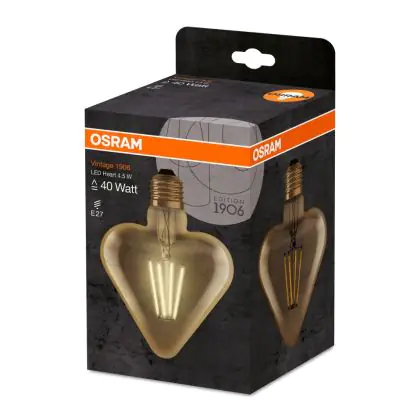 Die Osram Vintage 1906 LED E27 Heart 4.5W 825 Gold | Ersetzt 40W ermöglicht enorme Energieeinsparungen von bis zu 90 %. Dank des Standard-E27-Sockels klappt der Umstieg auf LED besonders einfach. Die Goldbeschichtung und die sichtbaren Filamentstäbe im Inneren des Leuchtkörpers machen die Vintage-LED zu einem echten Highlight. Der Leuchtkörper ist begeistert mit einer Herz-Form.