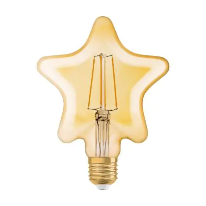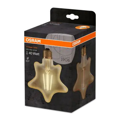 Die Osram Vintage 1906 LED E27 Star 4.5W 825 Gold | Ersetzt 40W ermöglicht enorme Energieeinsparungen von bis zu 90 %. Dank des Standard-E27-Sockels klappt der Umstieg auf LED besonders einfach. Die Goldbeschichtung und die sichtbaren Filamentstäbe im Inneren des Leuchtkörpers machen die Vintage-LED zu einem echten Highlight. Der Leuchtkörper ist begeistert mit einer Stern-Form.