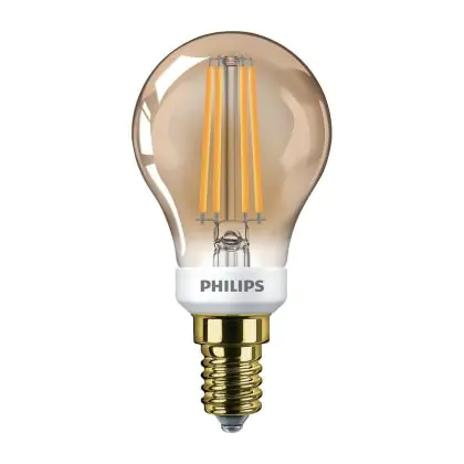 Die Philips Classic LEDluster E14 P45 5W 822 Gold ist eine LED-Lampe, die besonders effizient im Verbrauch ist. Sie verfügt über eine lange Lebensdauer und strahlt Licht in der Farbtemperatur extra Warmweiß aus. Sie bietet Ersatz für herkömmliche Leuchtmittel mit einem E14-Sockel und spart bis zu 85 % an Energie ein. Darüber hinaus punktet sie durch ein ansprechendes Design und einem goldbeschichteten Leuchtkörper mit sichtbaren Filamenten in Kerzenform.