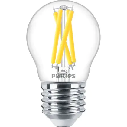 Die Philips MASTER LED E27 Kugel Fadenlampe Klar 3.5W 470lm - 922-927 Dim To Warm | Höchste Farbwiedergabe - Dimmbar - Ersatz Für 40W ist eine effiziente E27 LED-Lampe mit Retrodesign und der perfekte Ersatz für Ihre konventionellen 40W Lampen mit E27. Zudem strahlt sie Licht in der Farbtemperatur 2200K - 2700K Dim To Warm aus und punktet durch eine lange Lebensdauer.