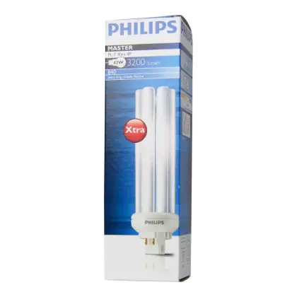 Philips PL-T Xtra 4P sind energieeffiziente Leuchtstofflampen mit 6 parallel angeordneten Leuchtstoffröhren. Sie haben eine doppelt so hohe Lebensdauer wie herkömmliche PL-T 4P. Philips PL-T Xtra 42W 840 4P sind mit einem GX24q-4 Sockel-Typ Pins ausgestattet. Die Größe beträgte 16,1cm.