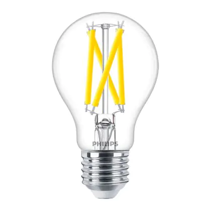Die E27 LED-Lampe von Philips kann mit der Farbtemperatur 2200K - 2700K Dim To Warm sowohl als Akzent- als auch als Allgemeinbeleuchtung verwendet werden. Als Faustregel gilt: Je niedriger der Kelvinwert, desto gemütlicher wirkt das Licht.