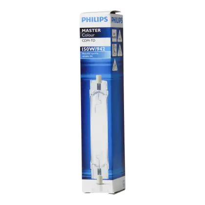 CDM-TD sind zweiseitige kompakte Entladungslampen mit einem brillanten Licht und ausgezeichneter Farbstabilität aufgrund ihrer Keramik-Brenner-Technologie. Die Philips CDM-TD 150W 942 RX7s (MASTERColour) ist eine kompakte Leuchtstofflampe mit einem RX7S Lampensockel. Dieser Lampensockel ermöglicht einen einfachen und schnellen Austausch. Es ist nicht möglich, diese Lampen zu dimmen.