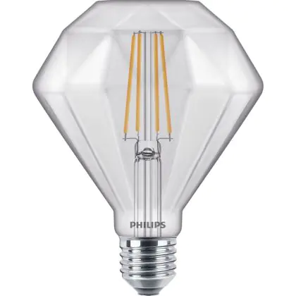 Die Philips Classic LEDbulb Vintage E27 Diamond 5W 827 besticht durch eine auffällige Eleganz. Die LED-Lampe in Diamantform hat einen Standard-E27-Sockel. DIe Vintage-LED verbraucht sehr wenig Strom, hat eine extra warmweiße Lichtfarbe und ist dimmbar.