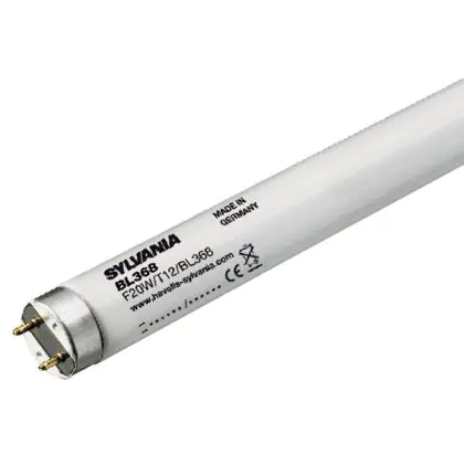 Die Sylvania BL368 T12 20W - Schwarzlicht | 60cm ist eine Leuchtstoffröhre mit einer Länge von 600 mm. Das Produkt hat einen Durchmesser von 38 mm. Die Röhre strahlt Schwarzlicht aus und punktet durch eine lange Lebensdauer.