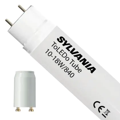 Die ToLEDo-Leuchte der Marke Sylvania ist eine T8-Röhre mit LED-Technologie. Sie verbraucht 10 Watt, wo herkömmliche Leuchtstoffröhren 18 Watt verbrauchen. Die Röhre ist 60 cm lang und strahlt kaltweißes Licht aus. Im Lieferumfang enthalten ist ein LED-Starter, sodass der Wechsel von Leuchtstoffröhre zu LED sehr leicht ist.