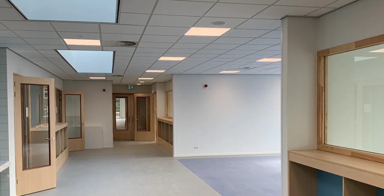 Die Klassenräume und die angrenzenden Flure wurden mit maßgeschneiderten LED-Panels und Downlights mit dem richtigen UGR-Wert (UGR<19 oder UGR<23) ausgestattet. Dabei handelte es sich hauptsächlich um kaltweiße Philips-Leuchten. Diese Lichtfarbe hält die Kinder wach und motiviert. Zur Grundbeleuchtung in den Korridoren nutzen wir die Designerleuchte Discus von Lumiparts.